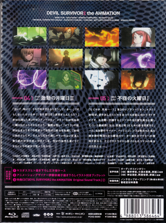 □内容□ 世界の終末まで、あと7日。その選択が未来を創る…。ニンテンドーDS用ソフト「デビルサバイバー2」をアニメ化!何が正義で何が悪なのだろうか。突如極限状態に陥った日本。その背景には日本全土を絶望の淵に叩き落して行く“謎の侵略者”が。残酷で壮絶な現実に翻弄される人々と、悪魔と契約し“謎の侵略者”と戦う力を得た個性豊かな13人の悪魔使いたち。これはそんな極限状態に置かれた人々の“葛藤と選択”の物語。